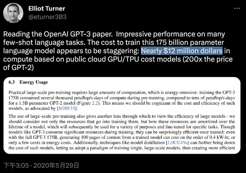 OpenAI没有追求模型在特定类型任务上的表现,而是不断的增加模型的泛化能力。同时,GPT3的训练费用,也到达了惊人的1200万美元。
