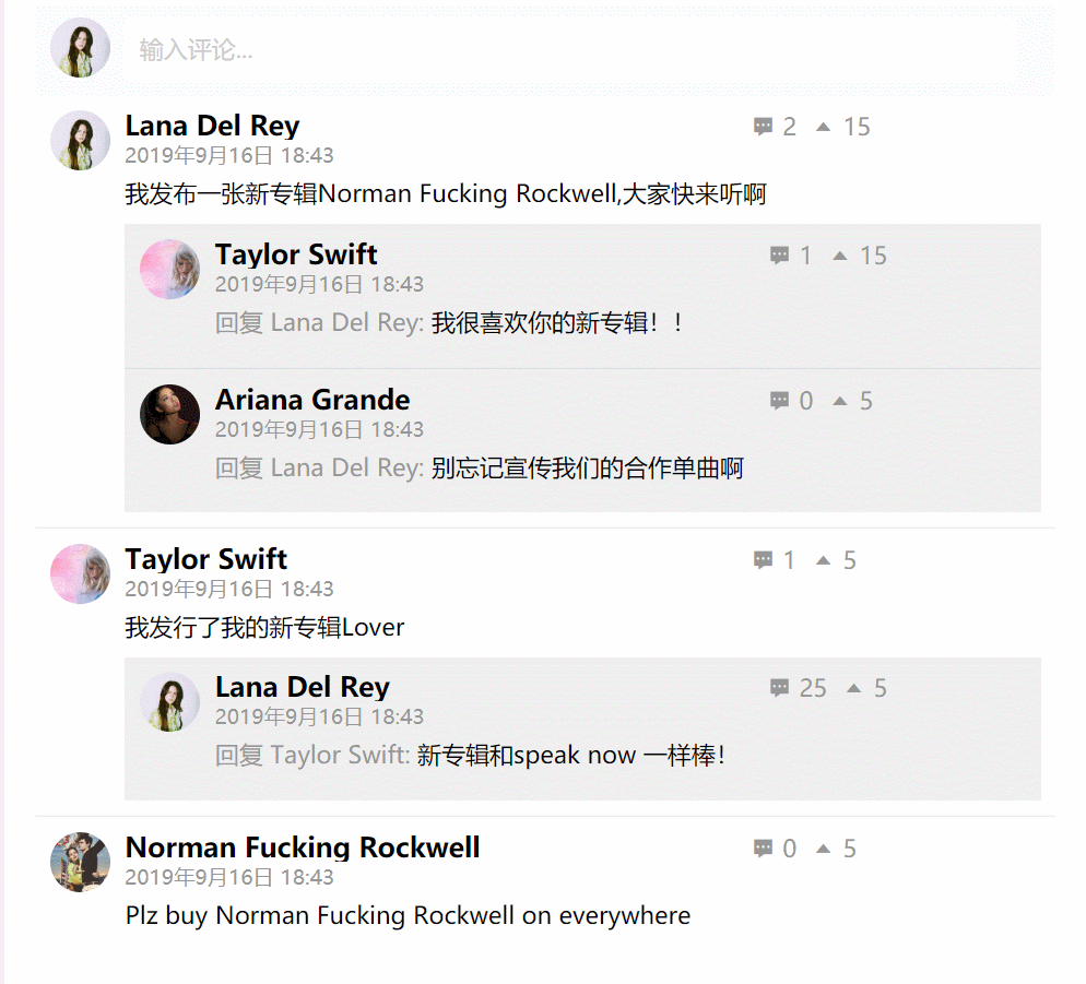 comment:'我发布一张新专辑Norman Fucking Rockwell,大家快来听啊',