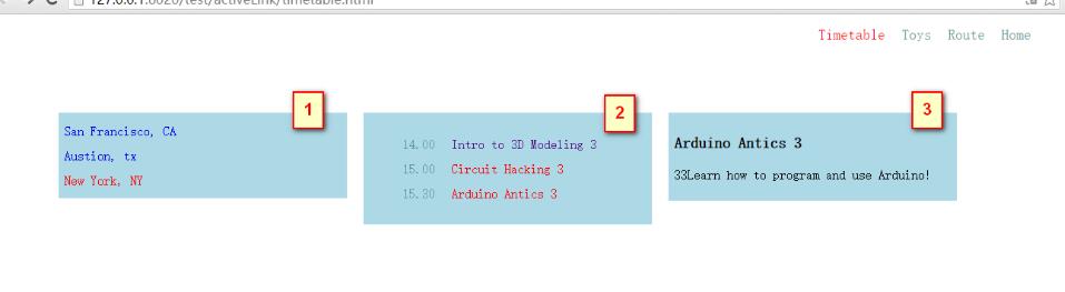 点击头部即右上角的链接时,页面会根据相应的链接加载新的内容,显示在下方;在中间区域有3栏,当点击1栏中的链接,2栏中会显现相应的内容,点击2栏中的内容,3栏中的内容又会根据2栏的链接来加载显示内容。