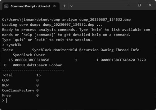 我们在lock上下文中同样调用了Debugger的Break方法,所以程序会在这里停下来。如果此时我们将当前进程的Dump抓下来,通过执行syncblk将正在被使用的SyncBlock显式出来,唯一的那个的Index正是15。