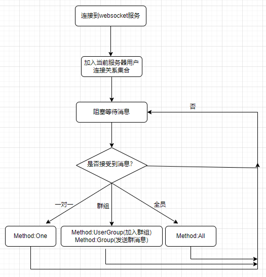 类中并不会包含当前用户信息,因为连接到当前服务的时候已经提供了客户端唯一标识。结合上面的处理代码我们可以看出,客户端用户连接到WebSocket实例之后,先注册当前用户的redis订阅频道并且当前实例仅注册一次全员消息的redis频道,用于处理非当前实例注册客户端的一对一消息处理和全员消息处理,然后等待接收客户端消息,根据客户端消息的消息类型来判断是进行一对一、群组、或者全员的消息类型处理,它的工作流程入下图所示