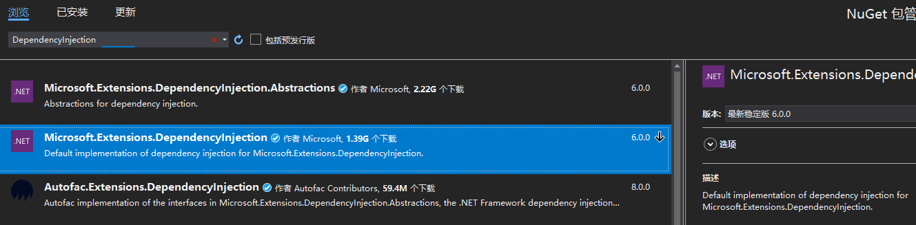 我们首先用代码来看什么是DI,在.net提供的扩展包Microsoft.Extensions.DependencyInjection中来完成DI,nuget安装。