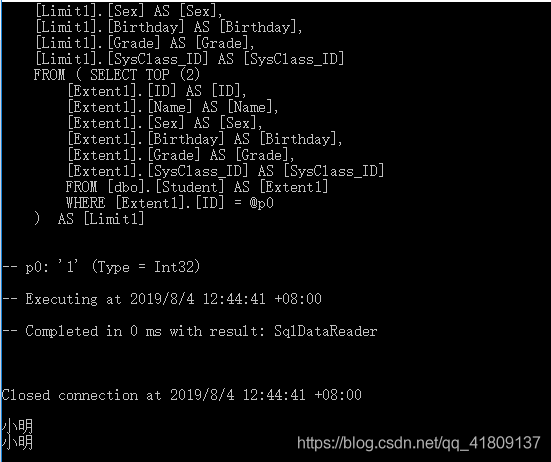 我们执行查询操作 发现控制台多了许多代码,这就是数据库的日志,当然,我们看到的这条sql语句,就是我们执行 var student = context.Student.Find(1); 这句话时,生成的sql语句,是不是用起来很方便,但是我们只需要查询主键是1的数据,他却给我们生成了这么长的一条sql语句,是不是看起来感觉EF其实也笨笨的,所以这就是EF不适合大型项目的原因。