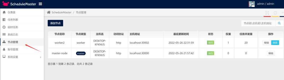 5.准备就绪后,使用后台查看节点管理,可以看到web主节点30000和任务调度的接口30002已经在运行