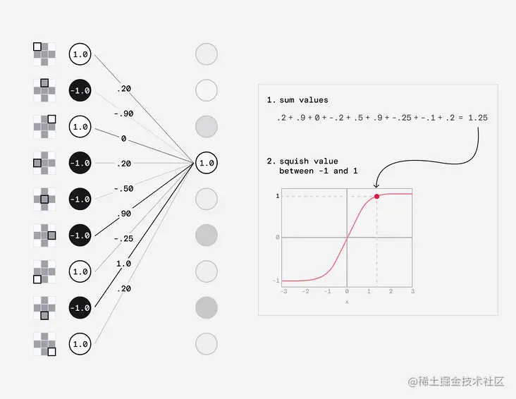 当一个值从输入神经元传递到下一层时,它会乘以权重。然后,该神经元简单地将其接收到的所有值相加,将该值压缩在-1和1之间,并将其传递给下一层中的每个神经元。