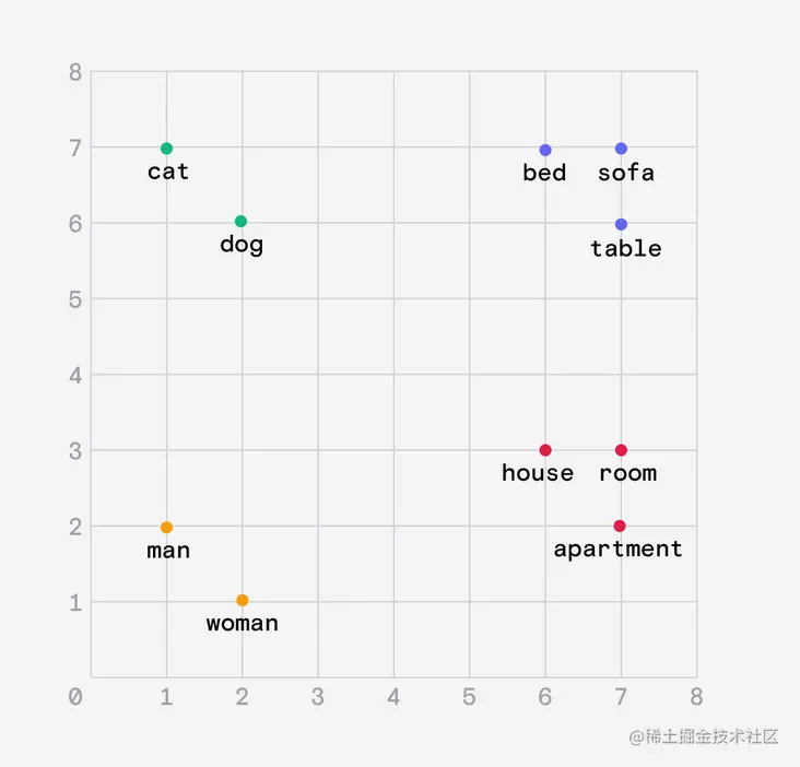 我们可以将每个 token 存储在一个多维向量中,指示它与其他标记的关系。为简单起见,想象一下在二维平面上绘制单词位置。我们希望具有相似含义的单词彼此靠近。这被称为 embedding 嵌入。