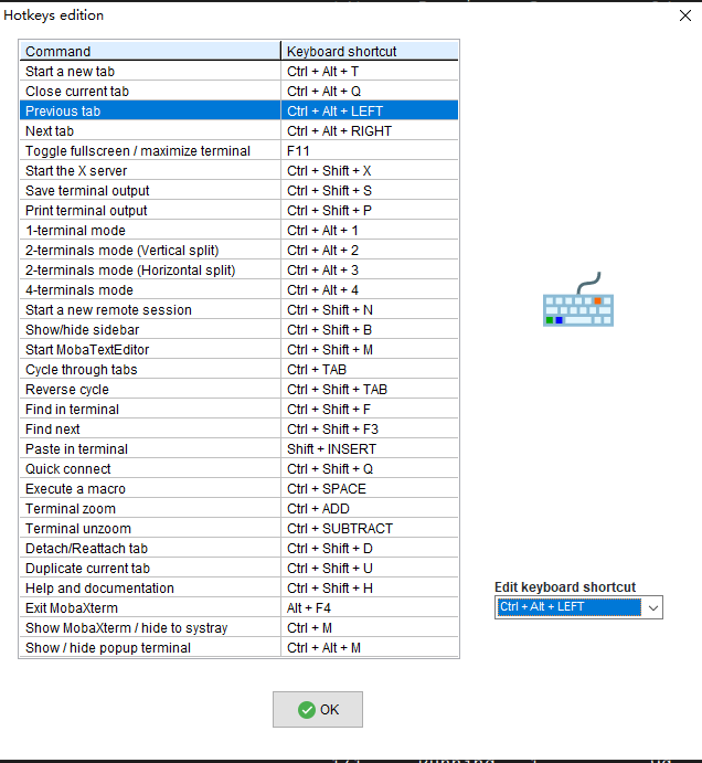 备注: 弹出窗口左侧<command,keyboard shortcut>表示<命令,该命令当前的快捷键>。选择需要修改的命令。右侧显示为键盘的图标下有命令提示符“Edit keyboard shortcut”点击下拉列表选择你需要的设定。