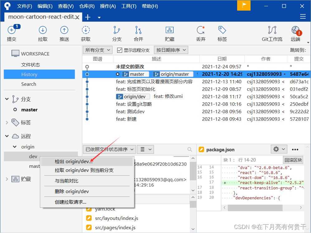 上图dev合并到了master上面,这时候我们选择合并前master的那一次提交,选择重置分支到此次提交。