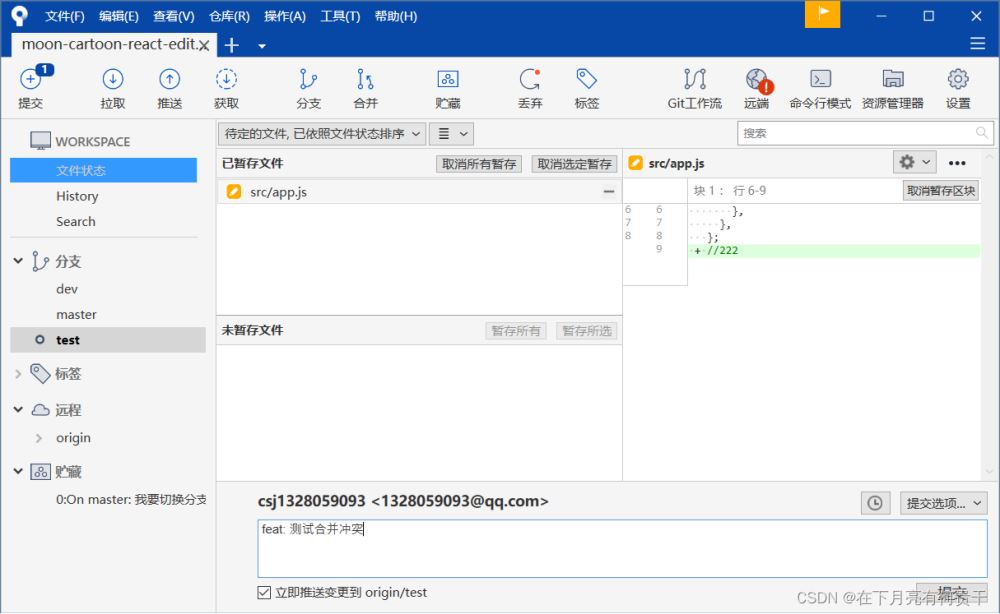 接下来我们切去test分支,在同样的位置,提交一个注释的222: