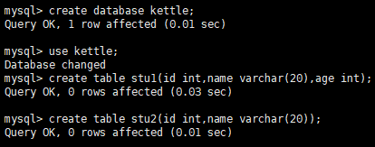 mysql> create database kettle; mysql> use kettle; mysql> create table stu1(id int,name varchar(20),age int); mysql> create table stu2(id int,name varchar(20));