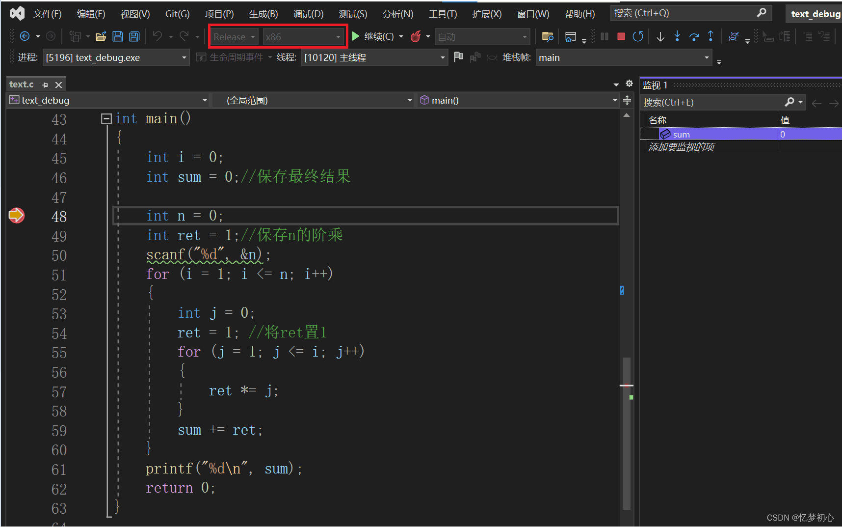 我们可以在ret*=j处设置一个断点,打开监视窗口监视ret和sum观察每个数阶乘的值和累加后的值,如下: