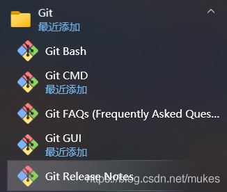 有 Git Bash、Git CMD、Git FAQs、Git GUI、Git Release Note,下面我们就分别介绍一下这几个。