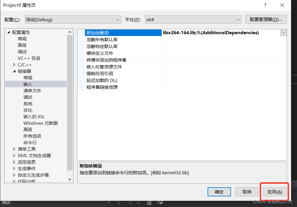 - 4.8 在链接器:输入->附加依赖项中,添加 libx264-164.lib
