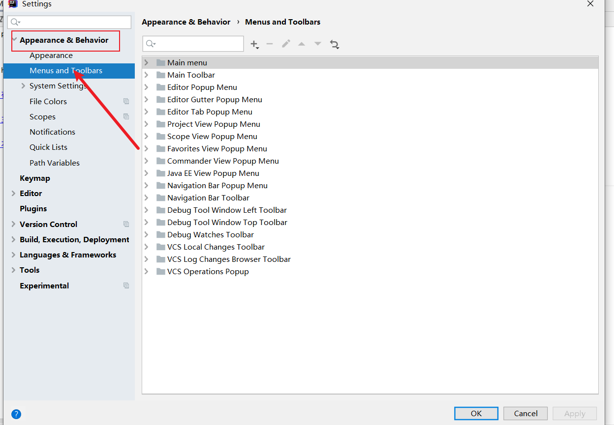 到Appearance & Behavior 找到 Menus and Toolbars这个选项
