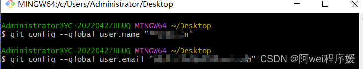 $ git config --global user.name "Your Name" 【你的名字】 $ git config --global user.email "email@example.com" 【你的邮箱】