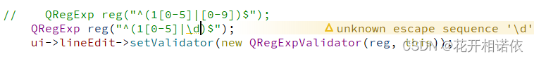 所以此处的 "^(1[0-5]|[0-9])$" 组合方式可以缩写成 "^(1[0-5]|\d)$",因为在Qt中使用\d好像被识别成转义字符了,提示如下面一样: